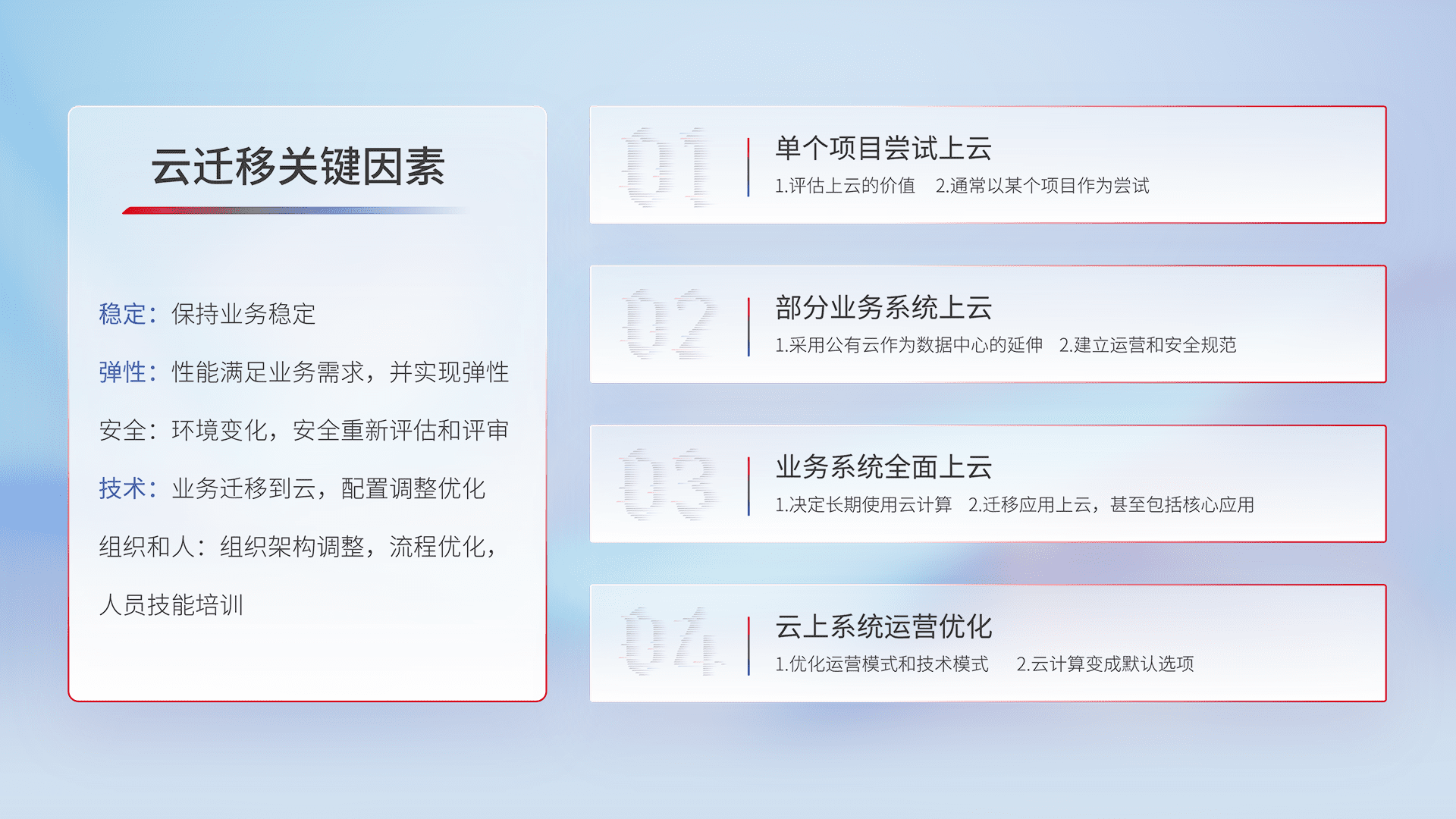 结合实际业务,,从规划设计、、、云平台选型、、、、云原生改造、、数据迁移、、、、集成交付,,,,迁移全过程为客户识别最佳上云路径,,,做好风险识别管理,,设计网络架构、、身份权限、、、安全审计合规、、、操作审计、、、日志审计、、、、监控告警策略、、、多站点容灾设计等,,对云上基础设施进行整体规划,,提升IT治理水平,,以满足弹性、、、、高可用、、、、高性能的需求。。。。